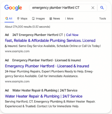 Smart targeting: “emergency plumber Hartford CT” or “water heater repair Stamford” – These show clear intent, meaning the person is ready to call.