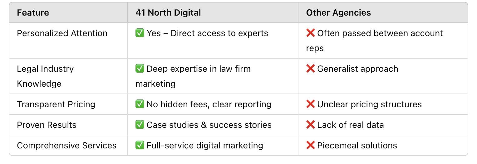 At 41 North Digital, we focus on helping Connecticut law firms stand out locally. We understand the unique challenges of marketing legal services in this state, from strict advertising rules to heavy competition in Google search results.